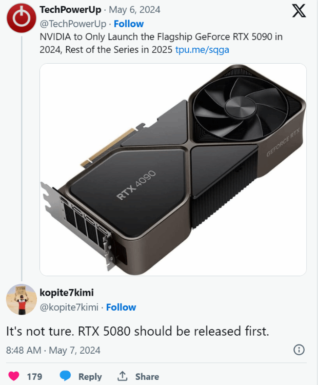 然而对于哪款RTX 50系列显卡会最先到来这一问题,另一知名曝料者Kopite7kimi表达了不同的观点。Kopite7kimi称次旗舰的RTX 5080将会比RTX 5090更早发布。