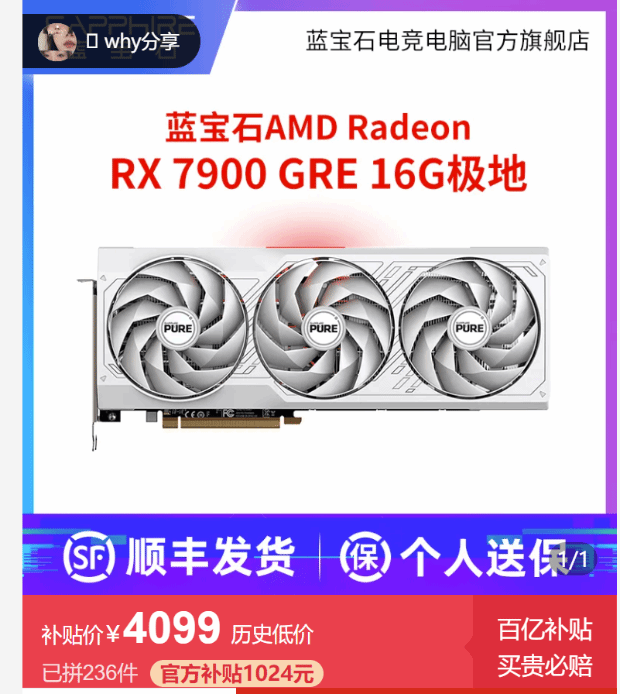 蓝宝石RX 7900 GRE 16GB D6 极地版显卡当前参与拼多多百亿补贴活动,官方补贴1024元,实付4099元可入手,十分适合想要打造高颜值白色主题DIY主机,且主打4K、2K分辨率高画质游戏大作的玩家。
