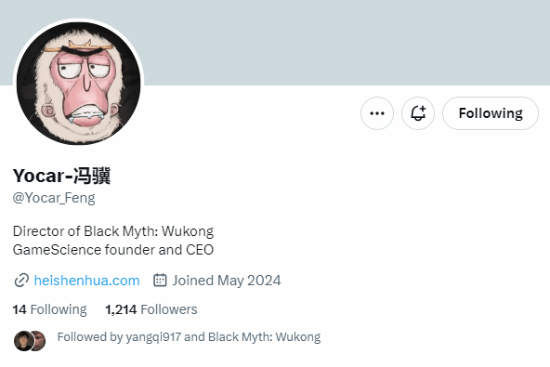 游戏科学CEO、《黑神话:悟空》总监冯骥已于近日开通推特账号,黑神话官号和主美杨奇也关注了他。