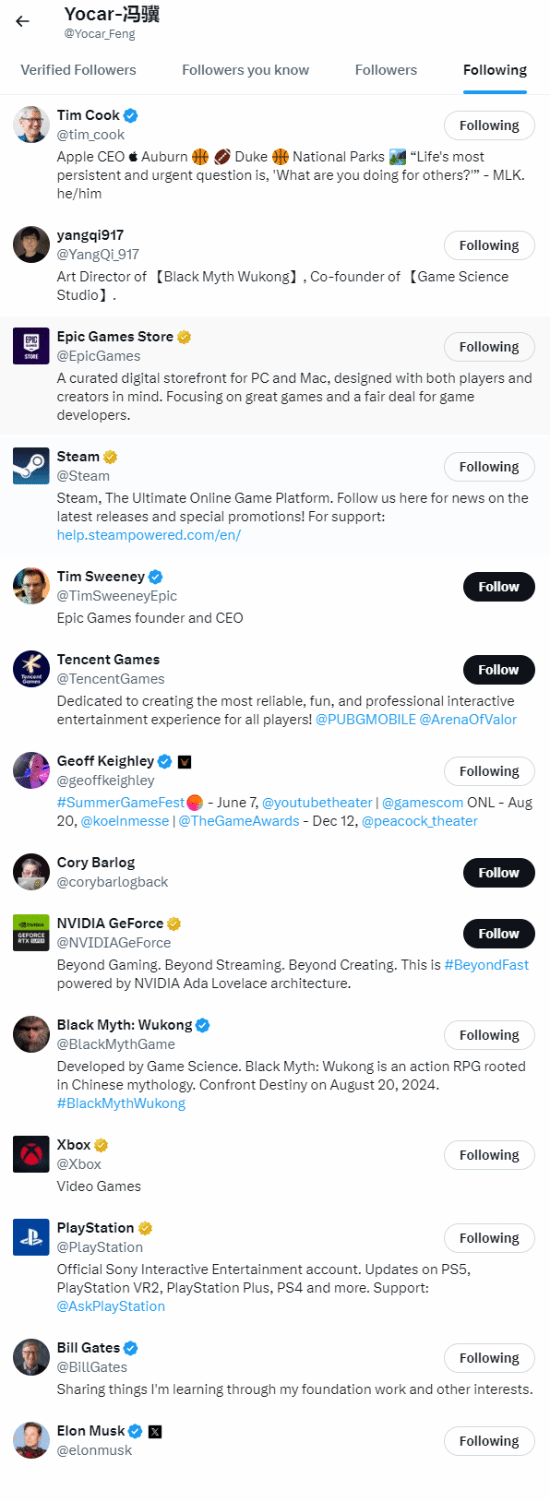 冯骥关注的账号有Epic、Steam、腾讯游戏、PS、Xbox等厂商,还有苹果CEO库克、TGA创办人Geoff、马斯克等知名人士。