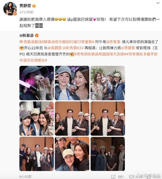 大合照中,陈紫函还贴心将缺席的贾静雯 p了上去,“倚天四美就是要整整齐齐的”。贾静雯稍晚转发回应:“希望下次可以到现场跟你们一起相聚了”。
