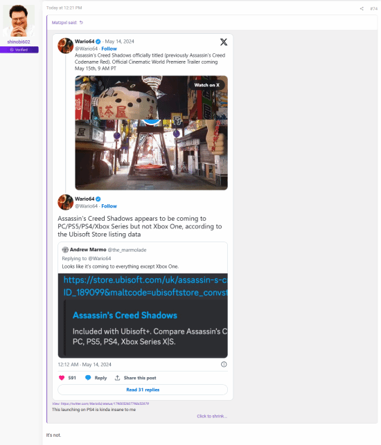 今日凌晨,育碧正式宣布《刺客信条:影》即将在5月16日北京时间0:00公开。而据外媒insidergaming报道,博主Shinobi602等多位内部人士透露,《刺客信条:影》不会在PS4与Xbox One平台发布,游戏只登录PS5、Xbox Series X|S与PC平台。