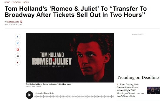 汤姆·霍兰德、弗朗西斯卡·阿梅乌达-里弗斯主演伦敦西区舞台剧《罗密欧与朱丽叶》完成预演 ,目前已放出一批剧场照片。