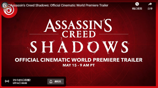 育碧已官宣日本背景的《刺客信条》定名《刺客信条:影》,首支预告将于5月16日零点公开。据PlayStation Game Size数据,预告片时长3分49秒。
