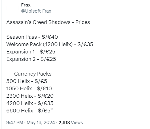 博主Dataminer Frax在游戏正式官宣之前提前透露了游戏名称,除此之外,他还曝光了游戏的DLC计划。根据他的信息,《刺客信条:影》季票售价为40美元/40英镑,其中包含两个可单独售卖的扩展包,价格为25美元/25英镑,以及Helix游戏货币。