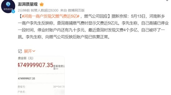 河南一商户发现欠燃气费近5亿 燃气公司:系统出错