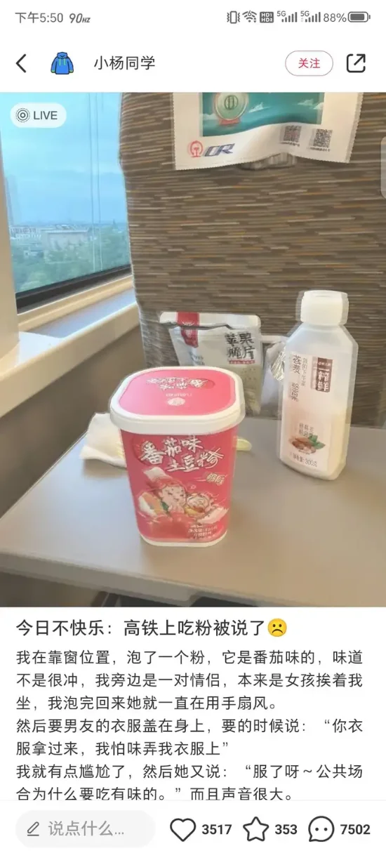 最近,有网友在社交平台称,自己在高铁泡了速食粉,被旁边人大声说“公共场合为什么要吃有味的”有网友认为公众场合气味太大确实影响别人,也有网友认为无关紧要。