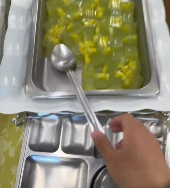 对此网友纷纷表示:“那个炖鸡,我以为是一锅鸡脖子”“从那个果冻开始就不想吃了,三餐准备果冻,厉害了”“头一次看食堂放这么小的勺子和夹子”“看起来那么有饭缩力的菜,勺子还那么小,蒯起来可够费劲巴拉的,要是味道真的很难吃,打菜都能打出来气”。