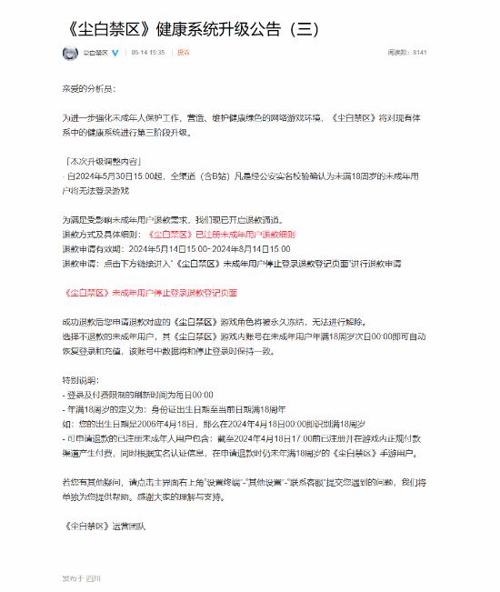 今日,《尘白禁区》手游官方在微博中正式宣布,为进一步强化未成年人保护工作,营造、维护健康绿色的网络游戏环境,《尘白禁区》将对现有体系中的健康系统进行第三阶段升级。自2024年5月30日15:00起,全渠道(含B站)凡是经公安实名校验确认为未满18周岁的未成年用户将无法登录游戏。