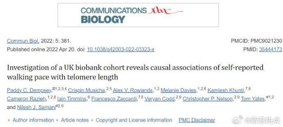 这项题为“Investigation of a UK biobank cohort reveals causal associations of self-reported walking pace with telomere length”的研究曾发表在《Communications Biology》杂志上。