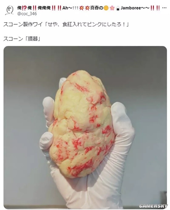 「我在制作司康的时候,想说加点红色色素就会变成粉红色了!结果却变成内脏了!」