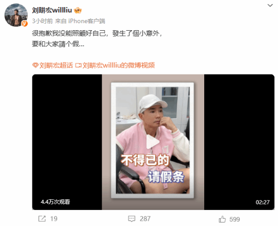 刘畊宏脚踝受伤坐轮椅:暂时不能带大家跳操了