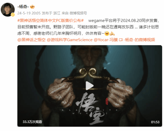 昨晚,《黑神话:悟空》主美杨奇发文表示,游戏预售还没开,可能游戏封版前一周还在通宵改东西。