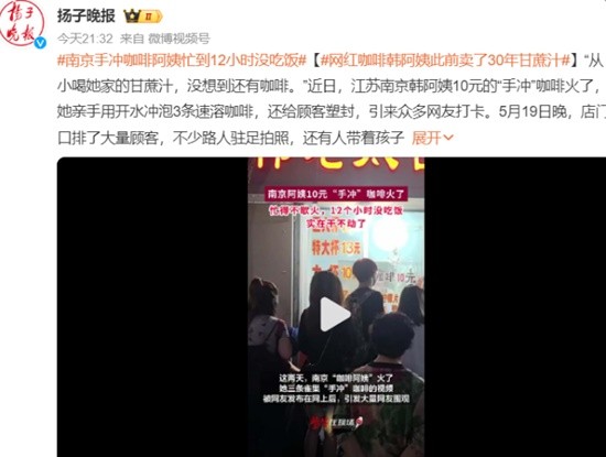 据扬子晚报报道,近日,江苏南京韩阿姨10元的“手冲”咖啡火了,她亲手用开水冲泡3条速溶咖啡,还给顾客塑封,引来众多网友打卡。很多人慕名前来购买,甚至有网友坐高铁专程赶来。