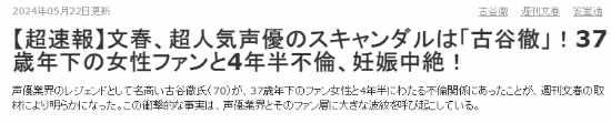 据日媒《周刊文春》爆料,现年70岁的知名声优古谷彻与一名37岁的女粉丝有着长达四年半的婚外情。