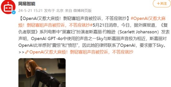 据网易智能报道,《复仇者联盟》系列电影中“黑寡妇”扮演者斯嘉丽·约翰逊(Scarlett Johansson)发表声明,OpenAI GPT-4o中使用的声音之一Sky与斯嘉丽声音极为相近,斯嘉丽对OpenAI此举感到“震惊”和“愤怒”,因此她的律师联系了OpenAI,要求撤下Sky。
