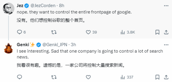 @Genki_JPN表示,担心其中的很多网站会被关停。Jez Corden回复称他们这是想掌控谷歌的整个首页。