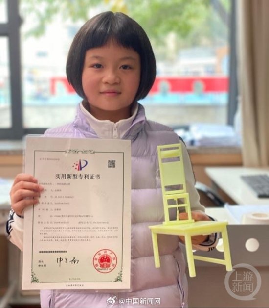 据悉,今年3月,徐紫琪发明的《一种防地震桌椅》获得国家专利,并获得2024年宋庆龄少年儿童发明奖重庆赛区小学组金奖。