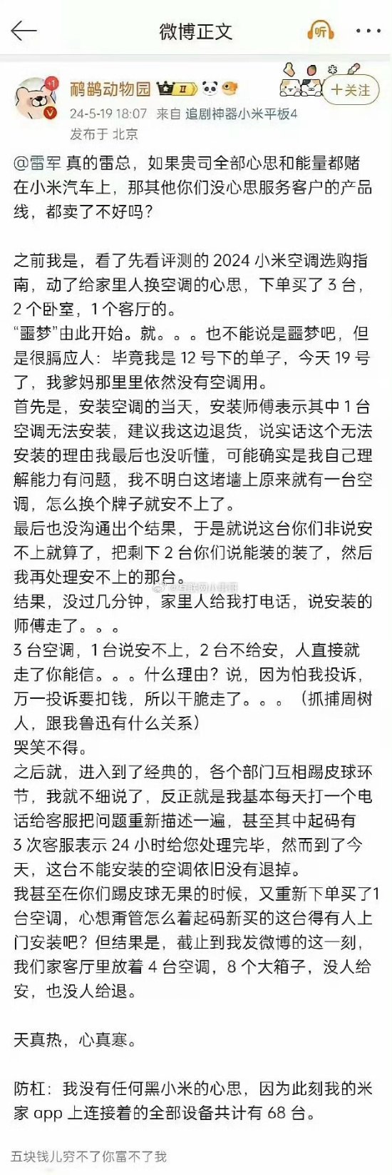 大V控诉小米空调无法安装 小米回应:与服务记录不符