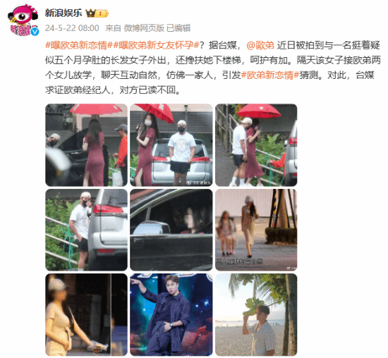 据新浪娱乐援引台媒报道,今日欧弟新恋情疑似曝光,欧弟近日被拍到与一名挺着疑似五个月孕肚的长发女子外出,还搀扶她下楼梯,呵护有加。隔天该女子接欧弟两个女儿放学,聊天互动自然,仿佛一家人,引发欧弟新恋情猜测。对此,台媒求证欧弟经纪人,对方已读不回,这更加加深了外界对欧弟新恋情的猜测。