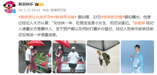 而就在被曝光后不久,欧弟本人则透过经纪人大方认爱:“交往快一年,肚里宝宝是小女生,但还没登记。”欧弟经纪人透露女方是圈外人,至于预产期以及何时打算补办登记,经纪人则表示欧弟目前还没有进一步透露进度。