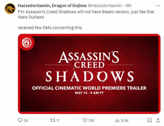 育碧于昨日公布了《刺客信条》系列下一部作品的名称:《刺客信条:影》。据@HazzadorGamin爆料称,本作和《星球大战:亡命之徒》一样没有Steam版本,仅登陆自家平台Ubisoft Connect。