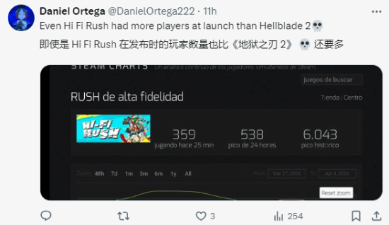 有网友表示,《Hi Fi Rush》首发时的玩家数也比《地狱之刃2》多。