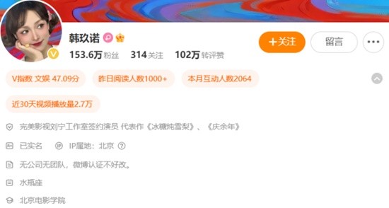 韩久诺的主页上,“庆余年”仍作为其代表作之一,而她自述的“小北漂,无公司,无团队”。