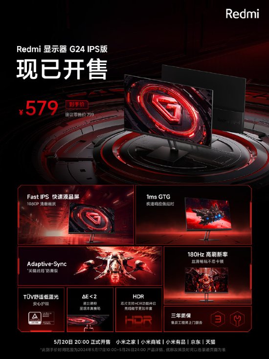 小米Redmi显示器G24 IPS版目前已经上架开售,首发579元。