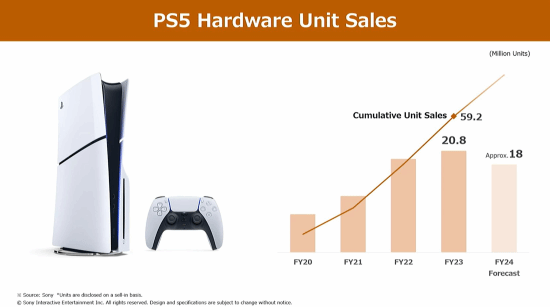索尼表示,整个2023财年PS5的出货量为2080万台,略低于修订后的2100万台的目标是。索尼预计,PS5在2024年财年的总销量将低至1800万台。