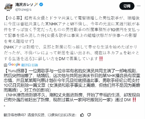 据日本知名推主滝沢ガレソ爆料称,一位与超有名女演员共同出演电视剧后闪婚的男歌手,与共同出演节目的某NHK主播发生婚外情。从描述来看,男歌手和女演员大概率是星野源和新垣结衣,两人共同出演《逃避虽然可耻但有用》后迅速步入婚姻殿堂。