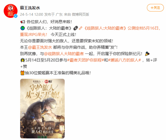 近日,霸王洗发水官方在微博中宣布,其将与《八方旅人》手游——《歧路旅人:大陆的霸者》进行联动,联动内容尚未知晓。