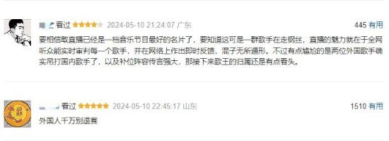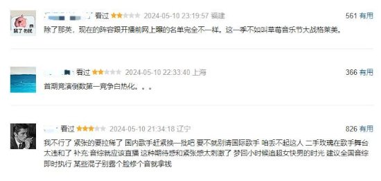 获得高赞的豆瓣短评纷纷吐槽,“这一季不如叫草莓音乐节大战格莱美”、“首期倒数第一竞争白热化”、“国内歌手赶紧换一批吧 ”。但也有评论对《歌手2024》创新性地采用直播地形式表示称赞,认为这“带回了期待感和紧张感”,展现了音综应有地魅力。