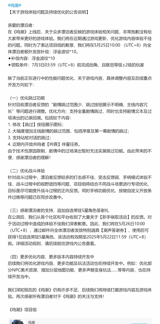 《鸣潮》官方今晚发布“关于游戏体验问题及持续优化的公告说明”,表示注意到了公测后玩家们反馈的问题。将向玩家发放限定10连、自选常驻五星等补偿。后续还将优化跳过功能、战斗体验等。