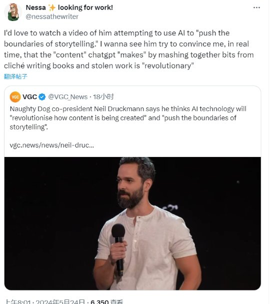 自由游戏作家兼叙事设计师Nessa Cannon写道:“我很想看一段他试图用人工智能'推动故事创作的界限'的视频,”她补充说,她希望看到Neil说服她,相信由ChatGPT“拼凑陈词滥调的书籍和被窃取的作品”生成的内容可以被视为“革命性”。