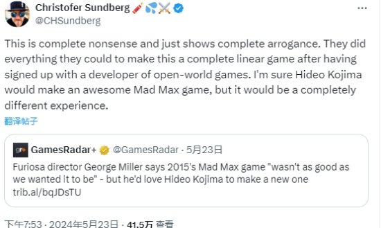 Avalanche Studio的创始人克里斯托弗·桑德伯格对此发帖表示强烈抵制,抨击道:“这完全是胡说八道,只是表现出彻彻底底的傲慢。在与一家开放世界游戏开发商签约后,他们竭尽全力使这款游戏成为一个线性游戏。我相信小岛秀夫会制作出一款很棒的《疯狂的麦克斯》游戏,但这将是完全不同的体验。”