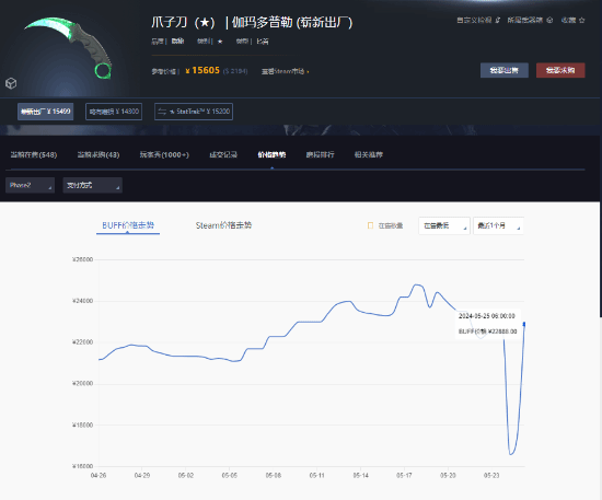 今日(5月25日),V社发布新补丁再次改回来了上述皮肤的展示效果,饰品价格随之复苏,以爪子刀伽马多普勒Phase 2为例,短时间内上下浮动价格超6000元。