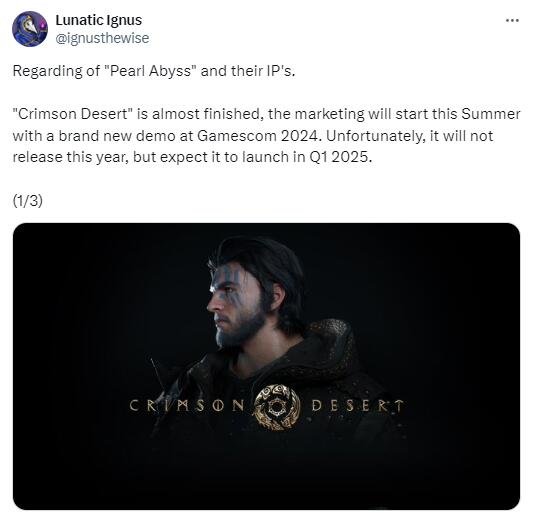 他在这则昨日的爆料中写道:“关于开发商Pearl Abyss及其IP。《红色沙漠》开发已接近尾声,将于今年夏天的Gamescom2024上推出全新Demo,并开始市场推广。遗憾的是,它不会在今年发布,但预计会在2025年第一季度发布。”