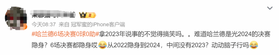 本场争冠战曼城中锋哈兰德未能取得进球。而据统计,包括本场比赛在内,哈兰德已为曼城出战了6场决赛比赛,但是颗粒无收。赛后“哈兰德隐身”相关话题登上热搜。