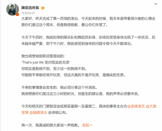 5月25日,在杭州演唱会开场前,陈奕迅登台宣布,因自己声带不适无法保障演出质量,本周末两场演唱会将延期至5月27日、28日。