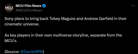 知情人士透露,索尼希望把这两位蜘蛛侠带回银幕。消息称这些角色将成为他们各自宇宙中的关键角色,独立于漫威宇宙。