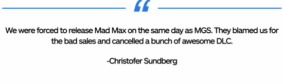 此外,华纳还坚持要求《疯狂的麦克斯》与小岛秀夫的《合金装备5》同时发行。此外,Sundberg透露团队原本有“很棒的 DLC”要发布,但由于游戏销量不佳,这些DLC被取消了。