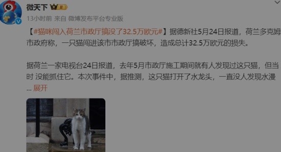 猫咪闯入荷兰市政厅 打开了水龙头致损失32.5万欧元