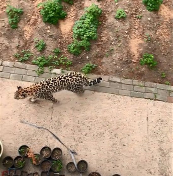 视频显示,一只身上布满花纹的豹子进入了村民家中,先是在院子里“溜达”,后又趴在地上不停啃咬。
