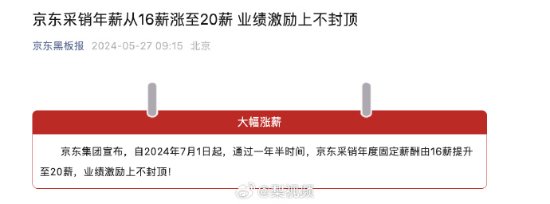 京东集团宣布,自2024年7月1日起,通过一年半时间,京东采销年度固定薪酬由16薪提升至20薪,业绩激励上不封顶。