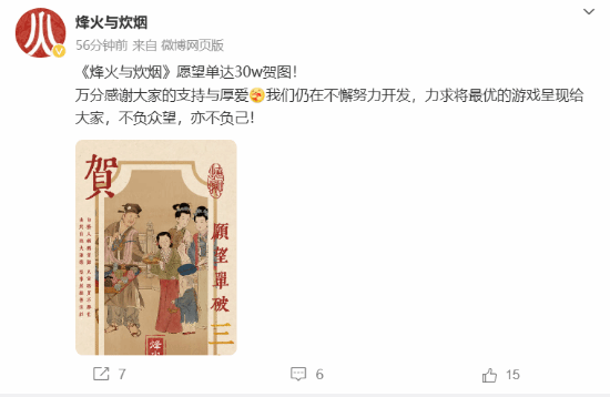 由国内团队FireWo Games制作,以中国古代为背景的开放世界RPG游戏《烽火与炊烟》今日发文,宣布本作的愿望单达30w,官方同时发布了贺图。