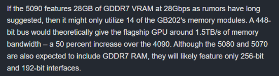 此外,还有爆料称GB202采用密集内存模式,包含16个模块和448位宽。如果5090像传言中所说的那样配备28GB GDDR7 VRAM,速度为28Gbps,那么它可能只会使用GB202的14个内存模块。理论上448位总线将为5090提供约1.5TB/s的内存带宽——比4090增加了50%。
