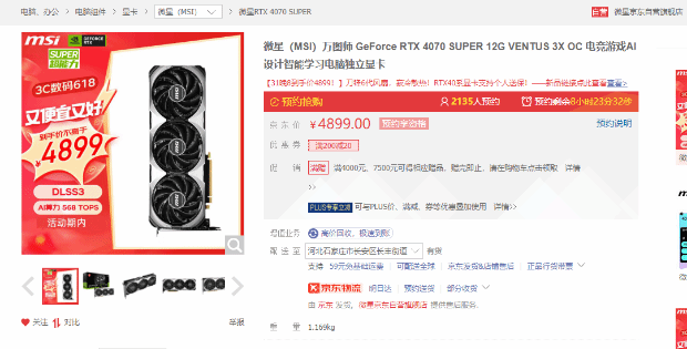 微星GeForce RTX 4070 SUPER 12G VENTUS 3X OC显卡的当前正在预约抢购,抢购价不高于4899元,目前已有2000余人参与预约,今天晚8点开抢。