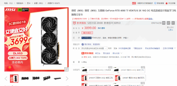 微星GeForce RTX 4060 Ti VENTUS 3X 16G OC万图师显卡的当前价格为3899元,今天晚8点开启京东秒杀,到手价格不超3699元。