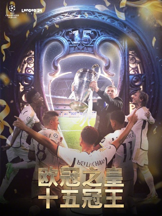 皇马官博也发文庆贺:“我们是冠军!!!!!!!!!!全场比赛结束,皇马2-0击败多特,夺得23/24赛季欧冠冠军!”